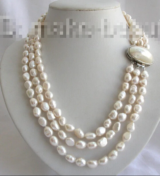 Free shipping@@@@@ Free shipping stunning 3rows 10mm baroque white freshwater cultured pearl necklace mabe b187 a